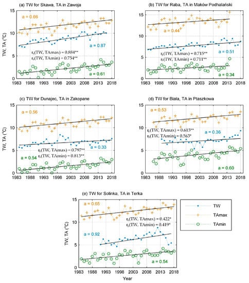 The course of annual water and air temperatures, and significant (p < 0.05) trend intensity a (°C per decade) for the studied rivers in comparison to air temperatures (TAmin, TAmax) at neighboring stations. The comparisons were made for: (a) TW for the Skawa in Wadowice and TA in Zawoja; (b) TW for the Raba in Stróża and TA in Maków Podhalański; (c) TW for the Dunajec in Nowy Targ-Kowaniec and TA in Zakopane; (d) TW for the Biała in Grybów and TA in Ptaszkowa; (e) TW for the Solinka in Terka and TA in Terka. Spearman’s rank correlation coefficient (rs) shows a significant correlation between the annual water temperature series and the annual air temperature series (TAmin, TAmax); rs significant at p < 0.001 and p < 0.05 was marked ** and *, respectively.