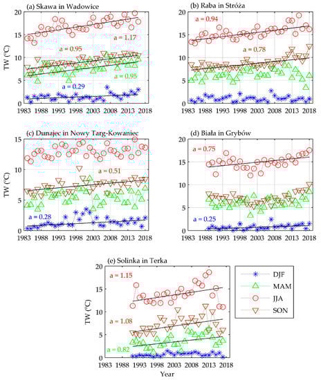 The course of seasonal water temperature and significant (p < 0.05) trend intensity a (°C per decade) for the studied rivers: (a) the Skawa in Wadowice; (b) the Raba in Stróża; (c) the Dunajec in Nowy Targ-Kowaniec; (d) the Biała in Grybów; (e) the Solinka in Terka.