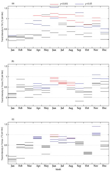Trend intensity a (°C per decade) for each month for the studied rivers (a) in comparison to air temperature trends for TAmin (b) and TAmax (c) at neighboring stations.