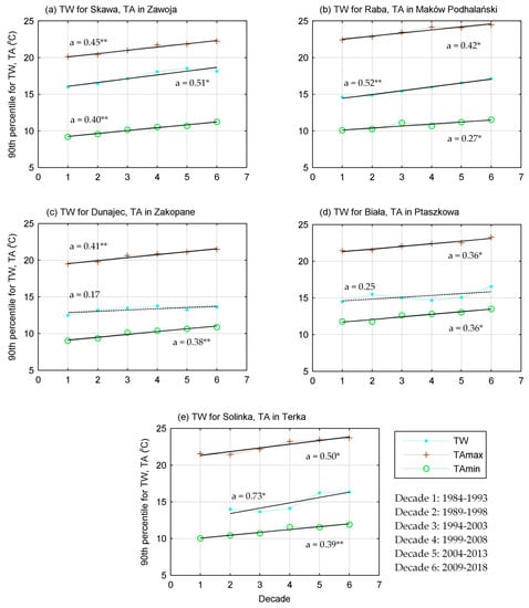 The 90th percentile for the monthly time series of water and air temperatures calculated in a moving window of 10 years with a 5-year shift. The comparisons were made for: (a) TW for the Skawa in Wadowice and TA in Zawoja; (b) TW for the Raba in Stróża and TA in Maków Podhalański; (c) TW for the Dunajec in Nowy Targ-Kowaniec and TA in Zakopane; (d) TW for the Biała in Grybów and TA in Ptaszkowa; (e) TW for the Solinka in Terka and TA in Terka. The intensity of the linear trend a (°C) is shown with its significance at p < 0.001 and p < 0.05 marked ** and *, respectively.