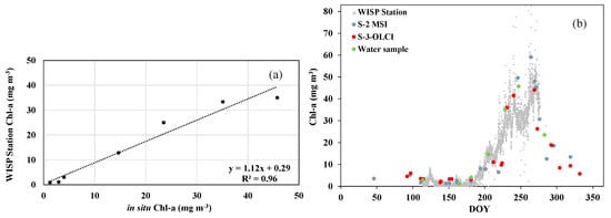 3.2. Validation of Chl-a Products Derived by WISPstation and Satellite Data