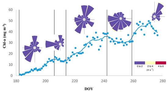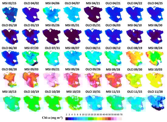 3.4. Temporal and Spatial Distribution of Chl-a Concentration from Satellite Images