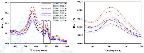 - Gower, J.F.R.; Doerffer, R.; Borstad, G.A. Interpretation of the 685nm peak in water-leaving radiance spectra in terms of fluorescence, absorption and scattering, and its observation by MERIS. Int. J. Remote Sens. 1999, 20, 1771–1786. [Google Scholar] [CrossRef]