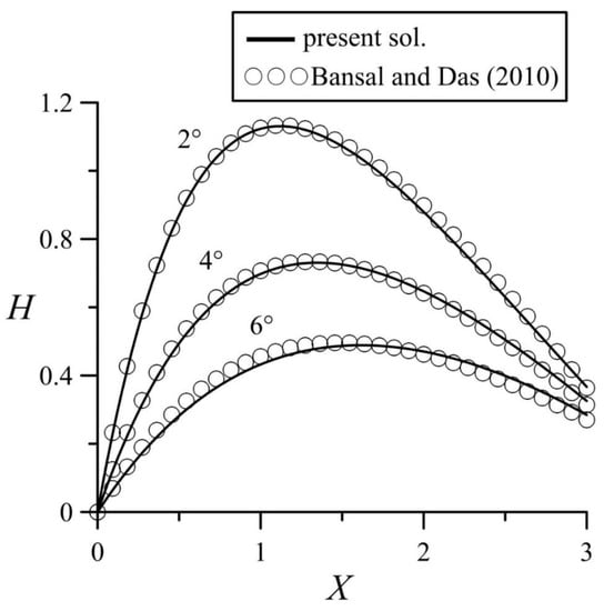 Bansal and Das [] used the Laplace transform method to solve the linearized Boussinesq equation and explored the effect of the constant recharge rate into a semi-infinite region on the groundwater table. The present analytical solution was verified with the results of Bansal and Das []. The following parameters were used: recharge length , soil layer thickness D = 7 m, hydraulic conductivity k = 0.001 m/s, soil water storage constant S = 0.34, initial water depth , and the recharge rate r = 4 mm/h. The results are illustrated in Figure 2. As shown by the three curves, the peak water level and its location were determined to be related to the inclination angle. The aquifer with a higher slope had a lower peak water level because of a higher groundwater discharge rate. The peak water level in the steep sloping aquifer was close to the end of recharge extent, X = 1. Because of the large inclination, the peak water level was reached rapidly. Figure 2 shows that the results of this study are consistent with the results of Bansal and Das [], especially for the cases of steeper slopes.