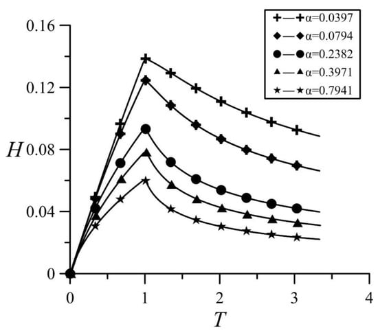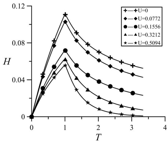 On the right-hand side of Equation (10), the second-order partial differential term and the first-order partial differential term are the hydraulic diffusion term and the extended term, respectively. In addition to the head difference, the main factors controlling the groundwater flow are hydraulic conductivity k and aquifer inclination angle . Therefore, we investigated the effects of the permeability factor and speed factor U on the groundwater response. As presented in Figure 3, the peak was determined to occur when the recharge was completed, and the water level decreased considerably as the permeability factor increased. The decaying time at which the groundwater level returned to the initial water level changed with various permeability factors. Specifically, the dimensionless decaying time at which the water levels separately decayed to half the maximum water levels was approximately T = 10 for = 0.0397, T = 4 for = 0.0794, T = 3.3 for = 0.2382, T = 2.2 for = 0.3971, and T = 2 for = 0.7941, signifying that the flow through the aquifer increased with the permeability, thus reducing the water level. However, as shown in Figure 4, the water levels decreased as the flow velocity factors increased. The decaying time at which the water levels separately decayed to half the maximum water levels was approximately T = 4 for U = 0, T = 2.7 for U = 0.0772, T = 2.3 for U = 0.1556, T = 1.6 for U = 0.3212, and T = 1.4 for U = 0.5094, indicating that the flow increased with the slope, thus reducing the water level. To summarize, the water level variation is more sensitive to than to U; that is, the influence of on water level changes is more prominent than that of U.