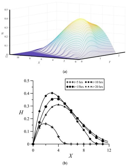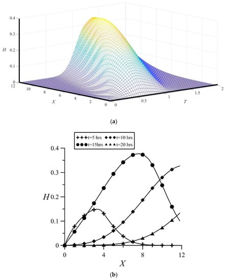 The effect of a unimodal rainfall event with hourly data ( mm/hr) on the groundwater level with , . (a) spatiotemporally distributed variation of groundwater level, and (b) variation of groundwater level in space at some specific moments.