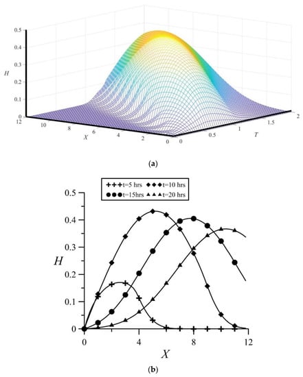 We designed a unimodal rainfall event with a duration of 11 h as a source of recharge to understand the effects of the speed factor U and the permeability factor on the groundwater translation. As illustrated in Figure 5, when the speed factor U was not considered (i.e., U = 0), the groundwater translation was only controlled by the permeability factor , therefore, the downstream translation of the groundwater level peak was slow. When the speed factor increased, as shown in Figure 6 and Figure 7, the downstream translation of the groundwater became more pronounced and rapid. For a fixed location (X = constant), the groundwater level considerably varied with the speed factor. This observation is corroborated from Figure 6 and Figure 7; when the speed factor was doubled, the peak water level swiftly moved downstream. Specifically, the speed factor had a more significant influence on the groundwater translation than did the permeability factor. However, when the permeability factor was the only factor controlling the transmission of groundwater, the downstream flow rate of the groundwater was slow, and the groundwater easily accumulated in the aquifer within the recharge area. By contrast, when we considered the speed factor U, we observed a fairly significant downstream movement of groundwater, and the groundwater was easily drained from the aquifer in the recharge area. These phenomena were graphically similar to those of water level; therefore, the corresponding figures are not presented herein. Moreover, as indicated in Figure 5, Figure 6 and Figure 7, the groundwater level increased rapidly within the duration, and the level peaked at the end of the duration and was less affected by both the speed factor and the permeability factor.