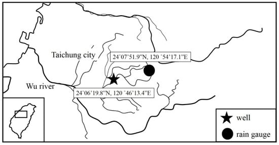To validate the presented solution, we collected observational data regarding the groundwater level and rainfall distribution at the gauge stations in the Wu River watershed in Taichung, Taiwan. Figure 8 illustrates the locations of the rainfall stations and groundwater wells within an 8-km range. In the Wu River basin, the soil in the areas from Taiping Mountain to Taichung is mostly Ultisols and Alfisols, which are categorized as red soil. The average hydraulic conductivity (k) of Ultisols and Alfisols measured by Obi and Ebo [] in a laboratory experiment was 3 m/day.