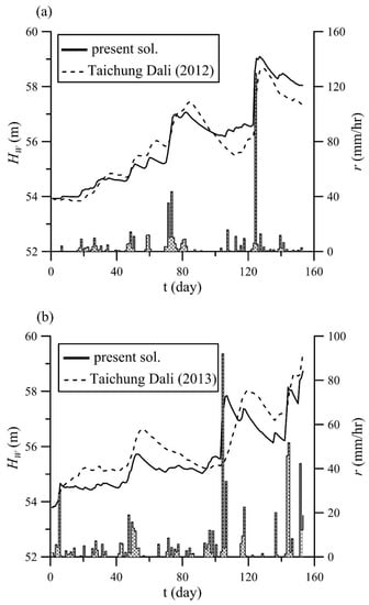 In reality, water table changes do not fully reflect rainfall changes, but there is a considerable correlation between the two. Clark et.al. [] estimated the magnitude of surface infiltration from the change of the relationship between groundwater storage and outflow. Based on the local geography data of this study, we used 25% of the rainfall intensity as the recharge rate by referring to the suggestion of Clark et al. []. The rainfall data and local soil type are based on the public information of the Taiwan government, and then according to the indoor experiments of Obi and Ebo [], the typical values of the corresponding parameters k and S can be obtained. After incorporating the relative parameters and recharge data into the derived solution, we observed that the simulated water level was relatively consistent with the groundwater level data, as shown in Figure 9. Figure 9a depicts a heavy recharge event with a recharge intensity of 50 mm/day at the Taichung Dali station on 10 June 2012, which resulted in an approximately 1-m increase in the groundwater level. Later, a 45-day non-recharge period caused a slight decrease of approximately 0.5 m in the groundwater table. Subsequently, a typhoon brought 125 mm/day rainfall, increasing the groundwater level by approximately 2 m. The variation between the present solution and the measured groundwater level is acceptable. Figure 9b depicts the measured groundwater level data at the Taichung Dali Station in 2013. The rainfall in 2013 was more evenly distributed, and the average rainfall intensity was lower than that in 2012. To quantitatively assess the difference between analytical and observational data, we performed an error analysis by evaluating the relative percentage difference (RPD), which is defined as follows: