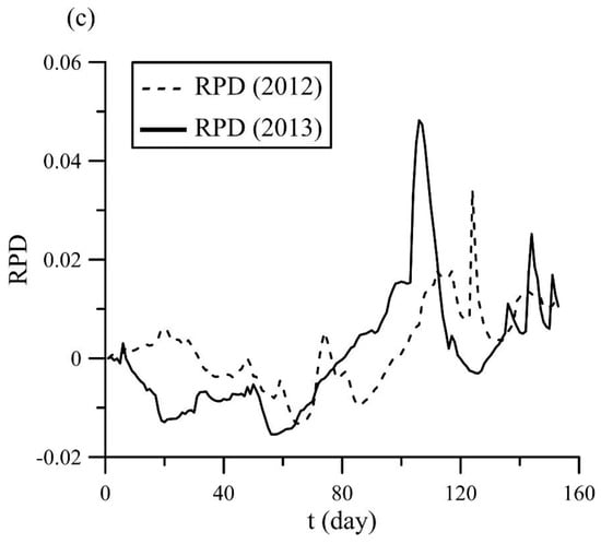 Variation of groundwater level due to time-varying recharge rate. The solid line denotes the simulated result of the present solution. The dashed line is the observed groundwater level at the Taichung Dali station in (a) 2012 (), (b) 2013 (), and (c) relative percentage difference (RPD) of simulation results and observational data.