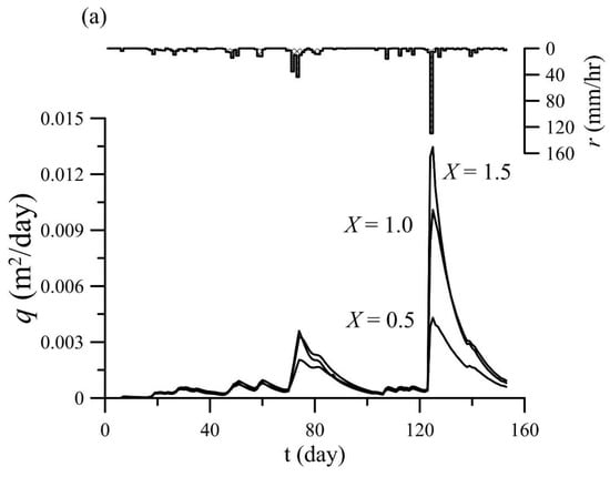 The variation of the flow discharge at different locations, X = 0.5, 1, and 1.5, under given rainfall events is shown in Figure 10. The outflow increased with rainfall, and further downstream, more flow discharge occurred because of the accumulation effect. It also can be seen from Figure 10 that in the case of low recharge rates, the difference in flow rate at different locations of the aquifer is not significant.