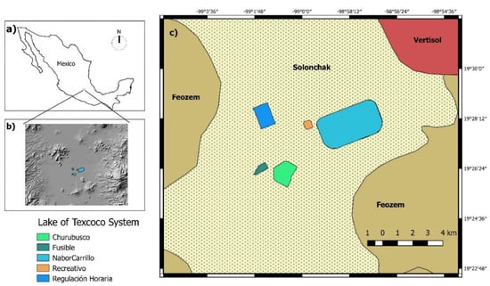 Study area. Geographic location of the study area (a), topographic map of the surrounding area of the Lake of Texcoco System (b), and map of soil types showing the location of lakes (c).