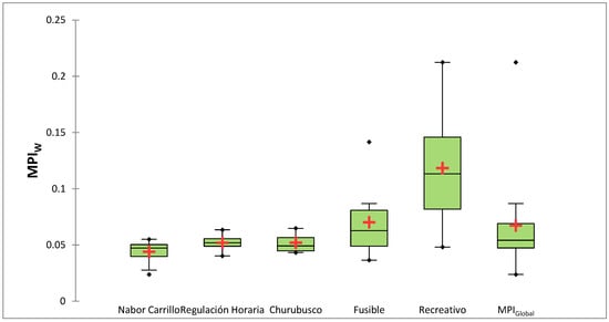 MPIW values ranged from 0.024 to 0.212 during the study period, showing differences in content across water bodies. The overall mean MPIW for all water-bodies was 0.067 (Global MPIW). Nabor Carrillo showed the lowest MPIW (0.044), while Recreativo showed the highest MPIW (0.212), as well as the greatest dispersion of data, indicating that it shows the greatest fluctuations in metal concentration through time (Figure 2).