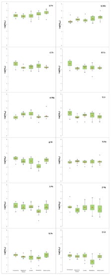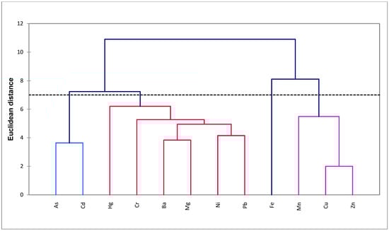 Significant differences were found for Log(Kd) values of metals in water bodies (one-way ANOVA F = 29.406, p < 0.0001). The Tukey’s multiple comparison test indicates that Log(Kd Fe) differs from all other Log(Kd) values. The Hierarchical Cluster Analysis yielded four groups: (I) As and Cd, (II) Hg, Cr, Ba, Mg, Ni, Pb, (III) Mn, Cu, Zn, and (IV) Fe (which differed from all other groups). The clustering corresponds to the gradient of Log(Kd) values (Figure 6). Group I clusters those metals with the lowest Log(Kd) values, i.e., metals available in the water column, in direct contact with the free-swimming aquatic biota. Group II corresponds to metals whose Log(Kd) has intermediate values lower than 3, which according to [22] are also elements prevailing in the liquid phase. Group III includes metals with the highest values, contained mainly in sediments, reflecting the nature of the substrate. Last, Group IV includes only Log(Kd Fe), with values suggesting that Fe is associated with the solid phase or particulate materials, forming stable compounds.