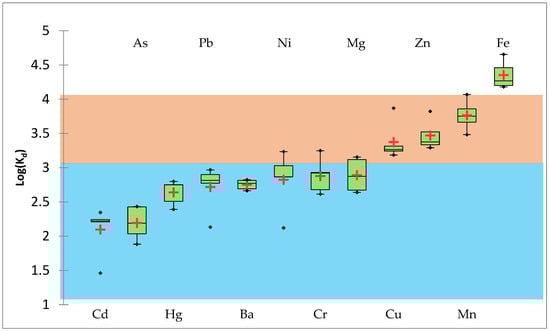 Box and whisker plot of mean Log(Kd) for the studied metals considering all water bodies. The blue band includes Log(Kd) < 3; the orange band, 3 < Log(Kd) < 4; and the white band, Log(Kd) > 4, as indicated by the criteria of Nebelkova and Kominkova [22].