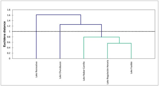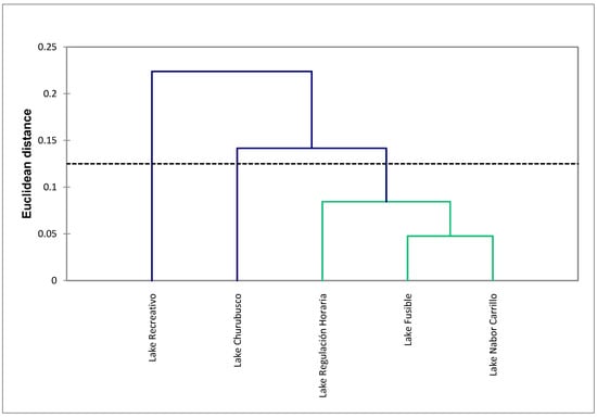 A hierarchical cluster analysis applied to the values of the Log(Kd MPI) by water body showed three groups (Figure 10): (I) Lake Recreativo, (II) Lake Churubusco, and (III) lakes Nabor Carrillo, Fusible, and Regulación Horaria. This cluster corresponds to the one obtained when Log(Kd) values were used by metal and water body (Figure 7); this clustering is consistent with the Discriminant Analysis.