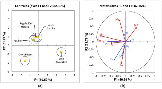 A discriminant analysis applied to Log(Kd) values by water body was significant (Wilks Lambda = 0.089, p < 0.0001), with the first two discriminant functions accounting for 82.36% of the explained variance. Centroids represent lakes, and three groups emerge: (I) Recreativo, (II) Churubusco, and (III) Nabor Carrillo, Regulación Horaria, and Fusible. Group I is characterized by the highest Fe and Mn values and the lowest Cd, As, Ni, and Pb, consistent with Figure 4e–g. Group II is characterized by Zn, Cr, and Cu; and Group III is influenced by Cd, Ni, As, and Pb (Figure 8b). All three groups are in agreement with the hierarchical cluster analysis (Figure 7).