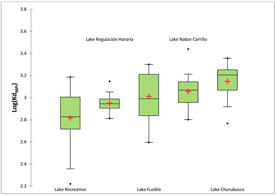 Thus, the criteria of Nebelkova and Kominkova [22] can be applied to Kd MPI as follows: Log(Kd MPI) < 3 indicates that the set of metals is found primarily in the water column. Values of 3 < Log(Kd MPI) < 4 include metals released from the solid or particulate phase into the water column. Log(Kd MPI) > 5 indicates metals associated with the solid phase. Log(KdMPI) can be calculated by water body to identify the phase where the set of metals quantified predominates (Figure 9). In the case of the Texcoco artificial lakes, Log (Kd MPI) values indicate that Recreativo and Regulación Horaria contain metals mainly in the water column, while Fusible, Nabor Carrillo, and Churubusco have metals in the liquid phase mostly coming from sediments.