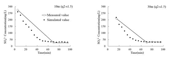 Figure 7 shows the dynamic time change process of simulated and measured surface concentration at different observation points, and Table 7 shows the corresponding ARE values. It can be seen that the initial value of concentration in surface water is relatively high due to the thin surface water layer at the beginning of sampling. As the irrigation water flows downstream, the surface water depth increases, and the concentration in both simulated and measured surface water showed a trend of gradual decline. The ARE values under different inflow rates are between 6.94%~13.91% and 6.60%~9.74%, respectively. This showed that the model can better simulate the change process of concentration.