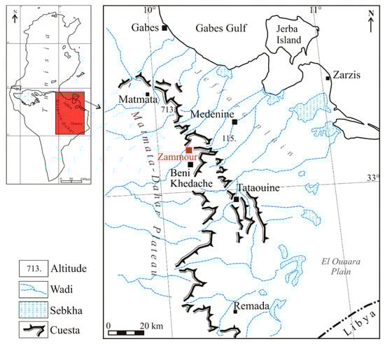 Location of the study area (Zammour) on the Matmata-Dahar plateau, Southeast Tunisia. Modified after Ben Fraj et al. [].