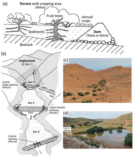 The Jessour form a hydraulic unit made of three main components (Figure 2a,b): (1) a dam (locally called Tabia or Ketra) between 2 and 5 m high and between 15 and 50 m long across the thalweg [], in the form of a small earth embankment, sometimes reinforced with stones, with a lateral spillway called Menfes or a central spillway called Masraf, made of stones; (2) a terrace, which includes the cropping area called Khliss and (3) an impluvium, which is the runoff sub-catchment area [,].