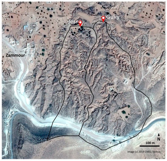 The Jesr instrumented in this study is located in the village of Zammour, in Southeast Tunisia. Zammour is part of the Beni Khedache municipality, located on the Matmata-Dahar plateau (Figure 1). This “Djebel” (Tunisian for “mountain”) is situated between the Jeffara plain, bordering the Mediterranean Sea and rich in sebkhas, and the eastern limits of the Sahara. It culminates at 713 m a.s.l. and is composed of a system of cuestas that gently incline to the west. The village of Zammour is located at an altitude of 540 m a.s.l. and lies on the cuesta back slope, which forms a depression covered by a layer of Quaternary fine sand and silt (or loess) several meters thick [,,,]. These fine sandy and silty deposits are the agricultural “wealth” of the region, which would otherwise lack soils deep enough for annual crops [,].