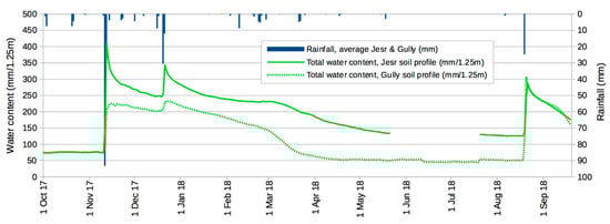 If we take the olive tree as an example, water needs are at maximum during the vegetative growth period. In Mediterranean climates, the growth period corresponds to two periods in the year: from March to June, during the spring awakening and flowering, and from September to October, during autumn vegetative development, when the olive fruits are growing []. In the summer period (July–August), the vegetative growth pauses and the olive trees reduce transpiration to adapt to the hot dry conditions. The effect of plant transpiration (as well as soil evaporation) is clearly observed in the Jesr and gully soil profiles, where water contents decreased at higher rates starting in early March. In the gully, the wilting point was already reached in early April: water was no longer available for the plants. In the Jesr, the drop in water content was slower and continued until June. During the vegetative break, the water content remained stable. If we assume that the August 2018 thunderstorm was an exceptional event, the major difference from this moment on is that the Jesr soil still had water available for autumn vegetative growth (55 mm), whereas no more water was available in the gully. In September, available water content again decreased due to the autumn vegetative growth.