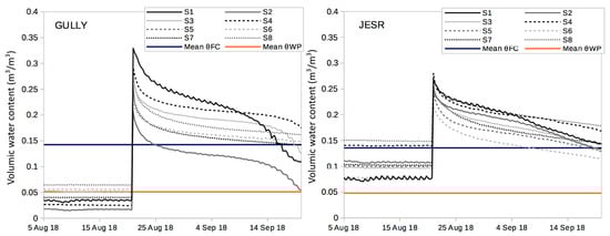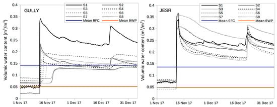 After two weeks of drainage, the majority of soil layers in the gully reached the average field capacity (Figure 6), with soil moisture values ranging from 0.14 m3/m3 deeper in the profile (S7 and S8) to 0.18 m3/m3 in the middle of the profile (S5). Only the shallowest layer (S1) still showed high values (0.25 m3/m3). In the Jesr, the moisture content of the soil layers was still very high, with values ranging from 0.18 to 0.3 m3/m3. Unlike in the gully, the wettest layers were the bottom layers, with values above 0.25 m3/m3 (S7 and S8) and the driest layers were in the middle of the profile (S3, S4 and S5). The two layers close to the surface (S1 and S2) drained more slowly after the drop following the rainfall peak and still showed high values (respectively 0.24 and 0.23 m3/m3) two weeks after the rainfall event. This situation was caused by the small rainfall events (<10 mm in 24 h) that occurred between 13 November and 19 December 2017 (see Figure 5), which moistened the soil layers near the surface, but not deeper.
