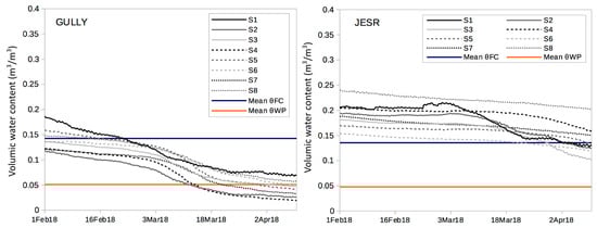 In each figure, the values of θWP and θFC averaged over the whole soil profile are indicated as benchmarks.