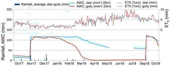 Daily ET0 values followed the same trend in the Jesr and the gully and how they evolved over the seasons is a key explanation for the evolution of AWC in soil profiles. In the early autumn of 2017 (October to mid-November), ET0 values were still relatively high, with an average of 4 mm/day. In winter (December–February), the ET0 decreased and remained relatively stable, with values between 1 and 2 mm/day. From March to June 2018, ET0 started to rise and to become more variable, with values ranging from 3 and 7 mm/day. In summer, the maximum observed ET0 was in July 2018, with peaks up to 10 mm/day. Then, from August to September, potential evapotranspiration decreased to values ranging from 4 to 7 mm/day. The cumulated ET0 for the whole monitoring period (28 September 2017–21 September 2018) was 1377 mm in the Jesr and 1403 mm in the gully.