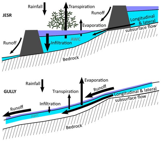 In the Jesr and the gully, θWP and θFC were estimated for every soil layer (i) using Rawls′ formulas []. These empirical relations are based on soil texture (%Sand; %Clay) and organic matter content (%OM).