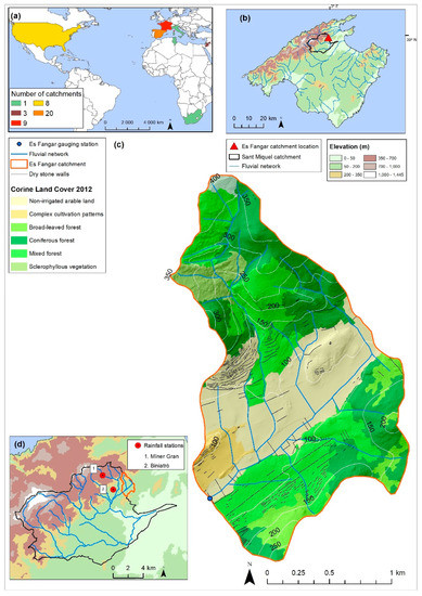 (a) Map of the small Mediterranean-climate catchments selected to assess the rainfall-runoff relationship at the annual and event scale. (b) Map of Mallorca Island, showing the location of the Sant Miquel River and Es Fangar Creek catchments. (c) Map of the Es Fangar Creek catchment, showing the different land-uses, the stream network and the gauging station. (d) Map of the Sant Miquel River catchment with the location of rainfall stations used in this study.