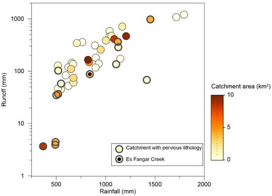 Rainfall-runoff for 43 small Mediterranean-climate catchments at the annual scale. Catchments with pervious lithology are marked with a grey halo. The Es Fangar Creek value is illustrated with a black dot.