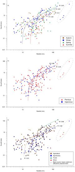 The role of transmission losses due to lithology has been investigated [32,60], depicting how low runoff values were recorded due to infiltration. In this study (see Section 3.2), events assessed in catchments with a predominance of pervious lithology showed a higher scattering than events in impervious catchments. In addition, rainfall events >55 mm generated R > 4 mm, except in events occuring in late spring in catchments with pervious lithology. In this case, the transmission losses due to pervious lithology have more influence on the hydrological response than the seasonal role of the water catchment reserves. Ries et al. [61] identified a low and large R response in rainfall events >50 mm based on the physiographic catchment and rainfall characteristics. Events occurring in catchments, which even had different land uses, with less bedrock permeability and less soil water storage but with higher values of rainfall intensity generate a greater R response than catchments with more bedrock permeability and soil water storage under low rainfall intensities. Contrarily, other types of lithology (i.e., badland areas) are characterized by a low infiltration capacity [62]. Latron and Gallart [63] observed that frequently badlands are the only active area to R response. According to these findings, Nadal-Romero et al. [64] observed an event stormflow coefficient of up to 20% in a Mediterranean-climate catchment with badland areas, even when the headwater catchment was forested (30% of the catchment area).