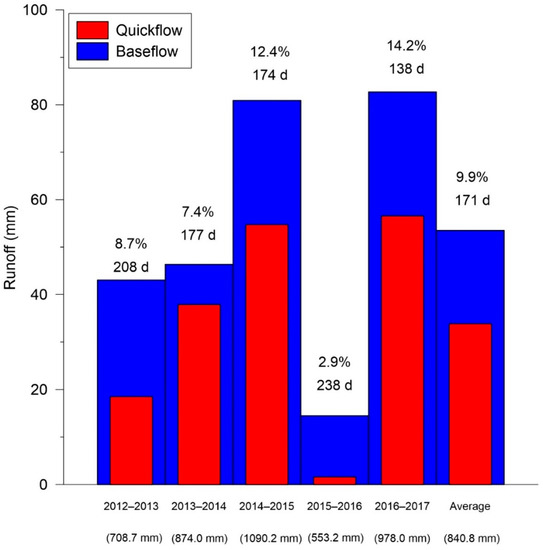 The mean annual rainfall (840.8 mm yr−1 ± 213 mm y−1) calculated over the five hydrological years (2012–2017) was broadly representative (−9%) of the long term mean annual rainfall (927 mm y−1 ± 215 mm y−1: 1965–2016), but showed a high range of variation (coefficient of variation 25%, being 553 mm y−1 to 1090 mm y−1), characteristic of Mediterranean conditions. Figure 4 shows the annual variability of rainfall, baseflow and quickflow contributions as well the annual Rc and the number of days with observed flow at the gauging station. Linear positive relationships were observed between annual rainfall, R, Rc, baseflow and quickflow (R2 ≥ 0.84, data not shown). The annual Rc ranged from 2.9% to 14.2% (mean value = 10.4%) and quickflow contribution from 9.9% to 45.0% (mean value = 33.0%). During the study period, flow was observed 42.8% of the time. From year to year, the cumulated number of days with flow ranged from 37.8% (138 days) to 65.2% (238 days) of the total days (Figure 4). An inverse relation between annual R and the number of days with flow was established. On the one hand, hydrological years with the largest R (2013–2014, 2014–2015 and 2016–2017) showed fewer days with flow and a lower baseflow contribution (<60%). In these years, 50% to 62% of the annual R was reached in 5 or fewer days (Table A2). In addition, days with more R were always during autumn and winter. On the other hand, the hydrological years with the lowest R (2012–2013 and 2015–2016) showed 208 and 238 days with flow. The baseflow contributions represented 70% and 90%, respectively, and 50% of the annual R was reached in 10 and 17 days, also respectively. The contribution of the 5 days with more R did not exceed 28% and 37%, respectively, and these days with more R were distributed among the four seasons.