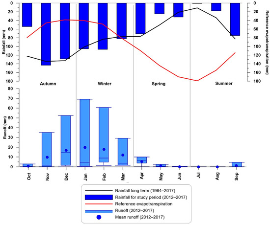 The seasonal dynamics of rainfall and evapotranspiration controlled the R response. Characteristic wet (winter) and dry (summer) periods alternated throughout the year, separated by transition periods (last autumn and early spring). Autumn was the rainiest season, with low evapotranspiration and flow observed at the outlet for 52.7% of the time, on average. The autumn mean Rc was 9.1% and ranged from 4.1% to 11.4%. During November and December, a continuous baseflow was generated in response to a large rainfall amount after the pre-filling of the initial water storage in October. From October to December, the mean Rc increased from 1.3% to 13.1%. Finally, the minimum, median, average and maximum monthly R amounts in December were higher than in November, even with lower rainfall amounts (Figure 5). Although differences between the hydrological years were observed, autumn was the season with less inter-variability in terms of R response.