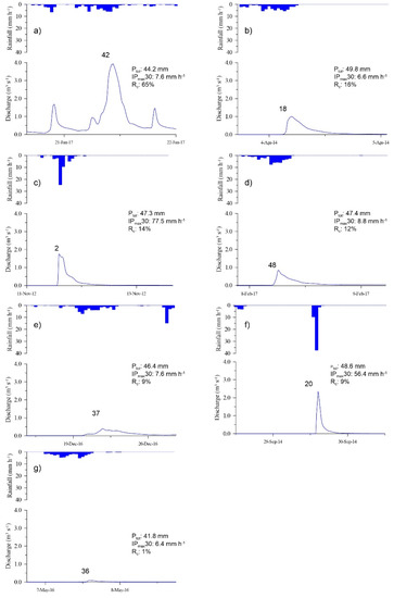 The event on 29 September 2014 (Figure 6f) occurred during the dry season (i.e., late summer, early autumn) but with an AP1d of 11.8 mm. The rainfall event was the shortest of these seven selected events (3.2 h), with the second highest IPmax30 (56.4 mm h−1) of the study period. This very high intensity triggered a R response during dry conditions. Similar rainfall but lower intensities during dry conditions always produced lower responses (Rc ≤ 3%). Although the R response was relatively small (4.2 mm) with Rc < 10%, Qmax was relatively high (2.356 m3 s−1), promoted by the rainfall intensity.