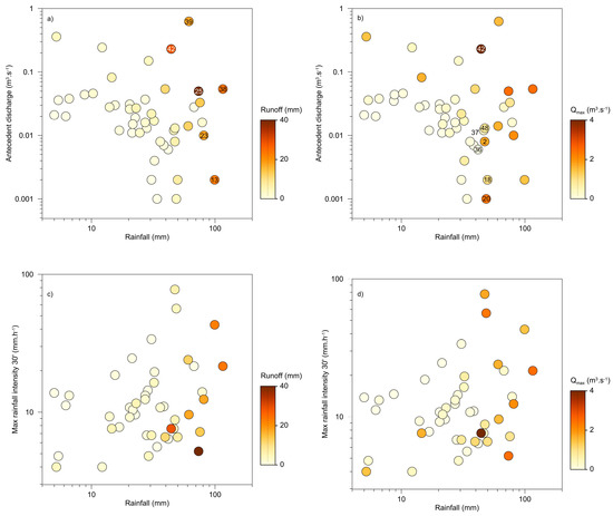 Multiples relationships between rainfall and R variables at the event scale at Es Fangar Creek: (a) rainfall-antecedent discharge-runoff; (b) rainfall–antecedent discharge-Qmax relationship; (c) IPmax30-rainfall-runoff and (d) IPmax30-rainfall-Qmax. The points with an ID are depicting the selected events for the non-linearity assessment, as it can be further consulted in Figure 6 and Table A3.