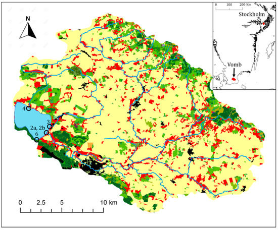 Map of Lake Vombsjön and its catchment area. The colors represent land use types: arable land (yellow), grazing areas (red), urban areas (black), and forest (green). The sampling points are shown with numbers: wastewater from on-site sewers (2a), natural groundwater (6), and tributaries Björkaån (2b), Torpsbäcken (3), and Borstbäcken (4). Infiltrated groundwater from boreholes (sampling point 1a) was collected at the drinking water treatment plant (outside of the map). The position of the water intake in the lake (sampling point 1b) is not shown on the map for security reasons.