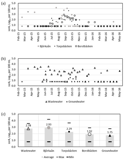 Measured concentrations of ssrA (Log10 per 100 mL) in the samples from/of (a) the tributaries Björkaån (sampling point 2b), Torpsbäcken (sampling point 3), and Borstbäcken (sampling point 4); (b) wastewater from on-site sewers (sampling point 2a) and natural groundwater (sampling point 6); (c) the maximum, average, and the minimum values for the series in (a,b). See Figure 1 for locations of sampling points. The concentrations below the limit of detection are shown in the figure as 0.78 Log10 per 100 mL (half the detection limit) for visualization purposes and were also used to calculate the averages. Values in (c) report the average, and the symbol attached to each bar corresponds to the symbols in (a,b).