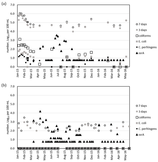In this study, a small number of samples were analyzed using traditional culture methods for enumeration of fecal indicator coliforms and E. coli, to compare with the real-time PCR method (Supplementary Material Table S1). We did not see any clear correlation; there were samples, for which the culture method detected coliforms and/or E. coli, while the real-time PCR did not detect ssrA, and vice versa. The culture analysis indicated higher concentrations of coliforms and E. coli in samples collected in colder water. These findings are corroborated by other studies in countries with more temperate climate where higher concentrations of coliforms correlated positively with cold water and high rainfall [7] and cold water and high conductivity [64]. Bacteria measured by culture methods (coliforms, E. coli and C. perfringens) (Figure 3) were efficiently reduced by the artificial infiltration, while ssrA DNA copies from real-time PCR analysis were detected in similar concentrations both before and after the artificial infiltration, indicating that the ssrA DNA were transported through the infiltration or that there were additional sources impacting the infiltrated water. Studies comparing molecular methods with culture methods have reported underestimation by real-time PCR [65], overestimation by real-time PCR [66], or comparable results [12]. Differences in primers, generation of standard curves, DNA extraction, as well as presence of inhibitors could all influence the outcome. Inhibitors, e.g., humic acid, might be present in fresh waters and can be transmitted in the DNA extraction and result in false negative results [67]. To avoid this, serial dilution of the sample is often used and analyzed together with the undiluted sample. On the other hand, the higher sensitivity of real-time PCR and the possible inclusion of both dead and alive cells might overestimate the number of viable bacteria. Additionally, the persistence of bacteria and of DNA copies may differ in the water environment [68,69].