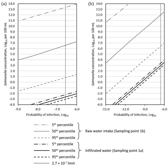 Using QMRA, we calculated the threshold Salmonella concentrations at the water intake and in the infiltrated groundwater from boreholes that should not be exceeded in order to meet the acceptable risk level looking at the 95th percentiles. We used this approach, instead of using the invA data as input to QMRA, due to the presence/absence nature of the invA data, and the fact that the presence of invA genes does not necessarily mean the presence of viable Salmonella cells posing infection risks.