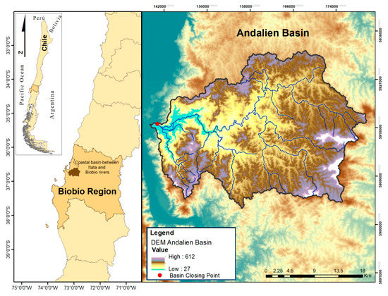 The Andalien basin is located in the Biobío Region, VIII Region of Chile, in the coastal mountain range, between 36°82′ south latitude and 72°80′ west longitude. The hydrographic basin, with 742 km2 of area, is part of the coastal basin located between the Itata and BioBio rivers in central-southern Chile. The area is composed of metamorphic rocks, partially superimposed by tertiary marine sediments, with moderate slopes [49], and elevations ranging from 27 to 613 m above sea level. The area is dominated by temperate-mediterranean climatic conditions and precipitations around 1250 mm annual, with a dry southern summer (December, January, February) of 64 mm and a rainy southern winter (June, July, August) of 664 mm, approximately. These conditions allow the direct relationship with the productive use of the territory, currently dominated by a large area of exotic forest plantations (Figure 1).