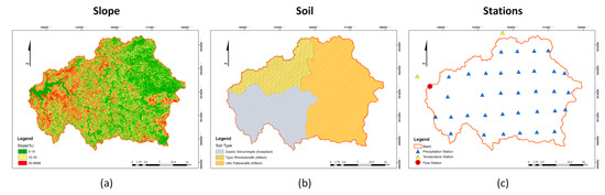 (a) Slope map, (b) soil types and (c) meteorological and flow stations.