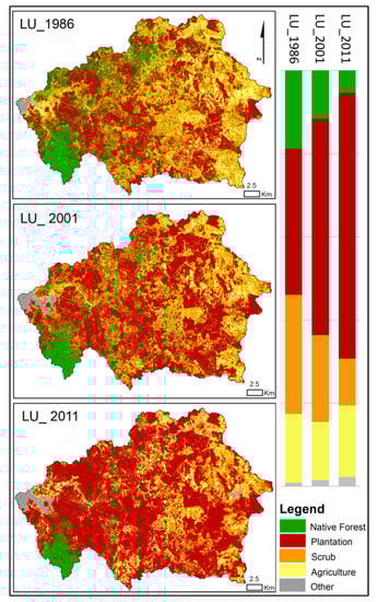 The LUCC time series analysis between 1986 and 2011 indicates an expansion of the plantations with a reduction in agricultural, scrubland, and native forest use (Table 3). Native forests, thickets, and forest plantations were the land covers with major changes in their percentages with respect to the total area of 1986. This result can be explained by the felling of native forests and scrublands between 1986 and 2011, with a 35% decrease with respect to the area occupied by this land use in 1986. Meanwhile, during the same period, forest plantations had a positive trend with a 55% increase with respect to the forest plantation area during 1986 (Figure 3, Table 3).