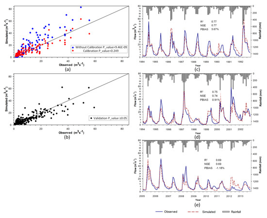 Relationship between uncalibrated and calibrated values against observed values (a) and validated values against observed values (b) for a model with proportional bias (y = z). Calibration and validation of the total monthly flow of LU_1986, LU_2001, and LU_2011 for the time periods of 1984–1992 (c), 1994–2002 (d), and 2005–2013 (e).