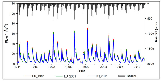 Simulated monthly flow between 1984–2013 for different land use/coverage scenarios (LU_1986, LU_2001, and LU_2011).