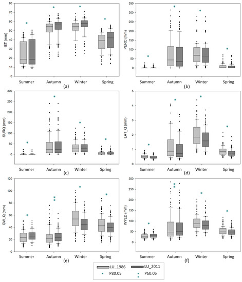 Figure 6 shows the seasonal averages from 1984 to 2013 of ET, PERC, SURQ, LAT_Q, GW_Q, and WYLD for LU scenarios LU_1986 and LU_2011, simulated using SWAT. On one hand, ET and surface flows had increasing trends in all seasons, reaching the highest values in the autumn and winter season, where the highest rainfall occurs. On the other hand, PERC values presented a negative trend for every season mainly due to the change in land cover. This trend becomes higher in autumn, which coincides with the humid period beginning. Besides, a direct correlation can be observed between GW_Q and the total flows of the basin in all the seasons. During winter and spring seasons, a sharp decreasing trend can be observed for GW_Q and the total flows due to the transition between the coldest and rainiest month and the beginning of the spring, which is a high contribution of the water accumulated in the subsoil. Conversely, during summer and autumn seasons, a very slight growing trend occurs due to the transition from the driest month to the autumn, forcing less water consumption and weak growth activity by forest plantations (Figure 6).