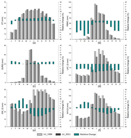 Monthly averages and relative changes of (a) ET, (b) PERC, (c) SURQ, (d) LAT_Q, (e) GW_Q and (f) WYLD for scenarios LU_1986 vs. LU_2011.