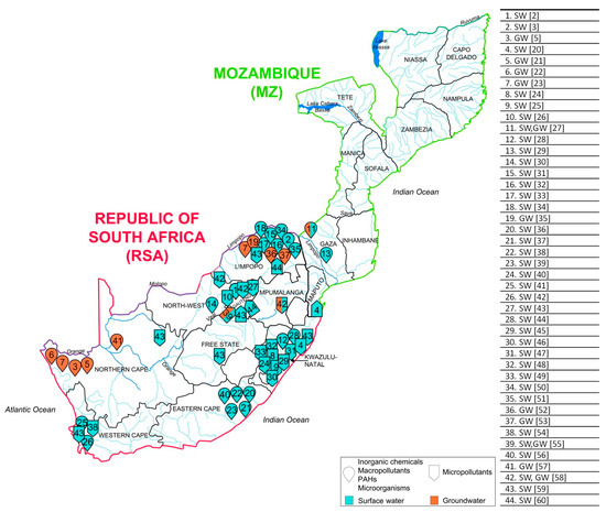 This study collects quality data on the surface water and groundwater in RSA and MZ from 44 peer reviewed papers published between 2001 and 2019. Forty-two papers refer to RSA and only 3 to MZ (one paper [20] presents data from both countries); 36 papers provide concentrations of pollutants in surface water bodies (20 for a first group of contaminants including: macropollutants, polycyclic aromatic hydrocarbons (PAHs), inorganic chemicals, and microorganisms, and 16 for a second group covering different classes of micropollutants) and 11 in groundwater (9 for the first group of contaminants and 2 for the second group).
